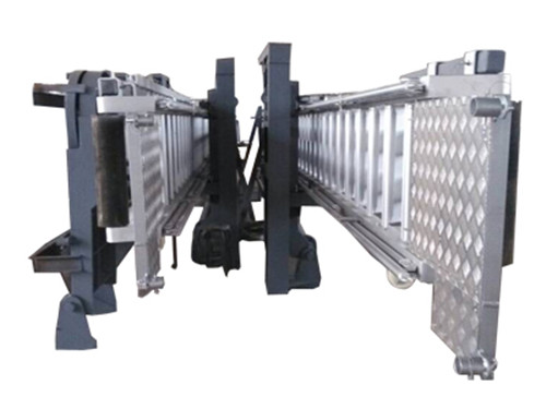 舷梯按其踏步形式可分为两种。一种是活动踏步舷梯,其踏步与梯架铰接,踏步下方中间有一根传动杆将上下平台和所有的踏步连在一起,当舷梯与水平面的夹角发生变化时,在传动杆的带动下,踏步和下平台始终保持水平状态。另一种为固定踏步舷梯,其踏步为弧形曲面型材与梯架焊接固定。舷梯的上平台有旋转式和固定式,目前常用的为旋转式平台。舷梯可在水平方向略有转动。